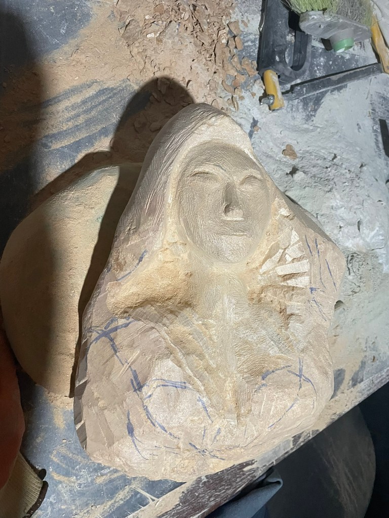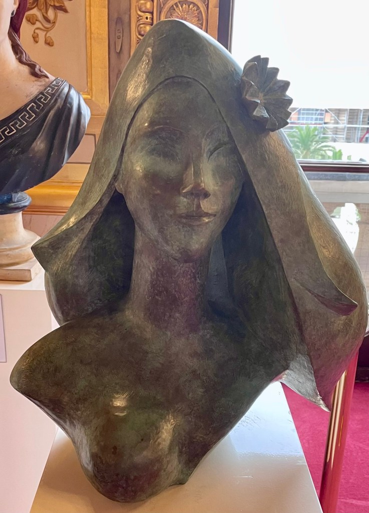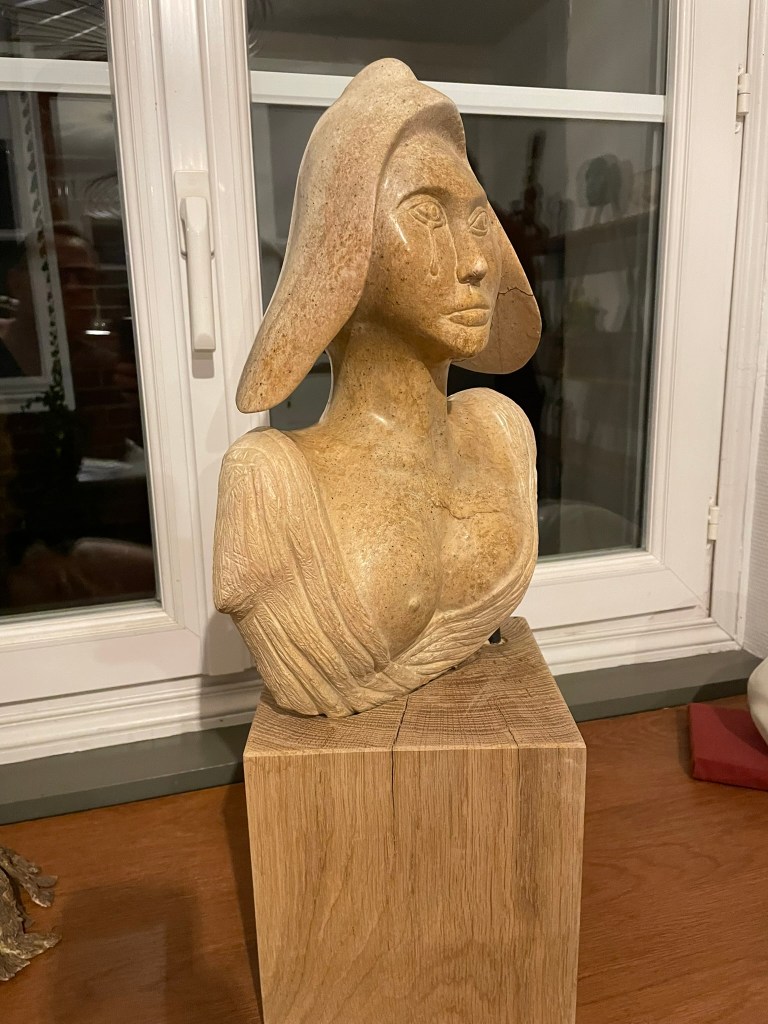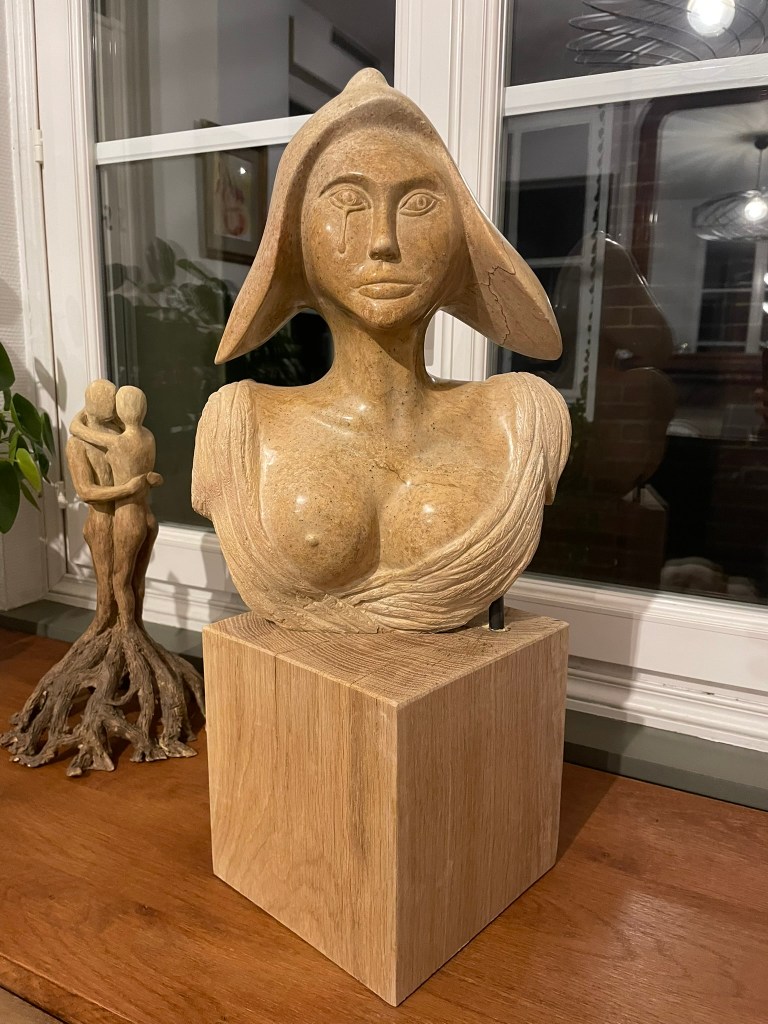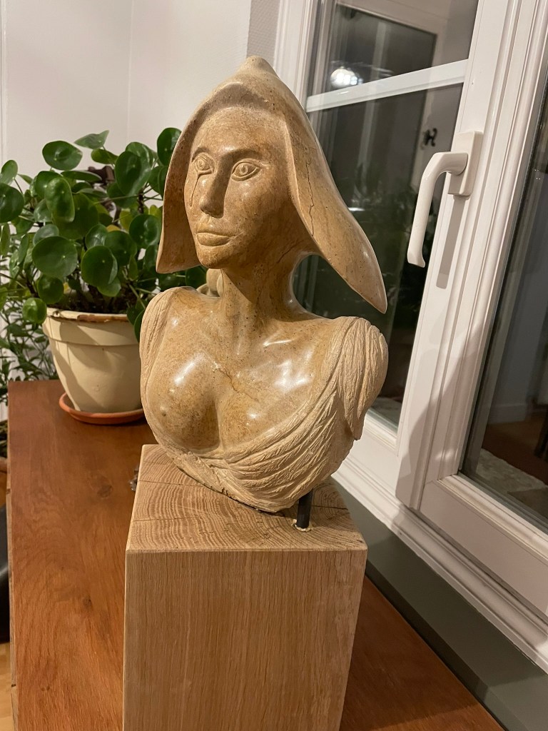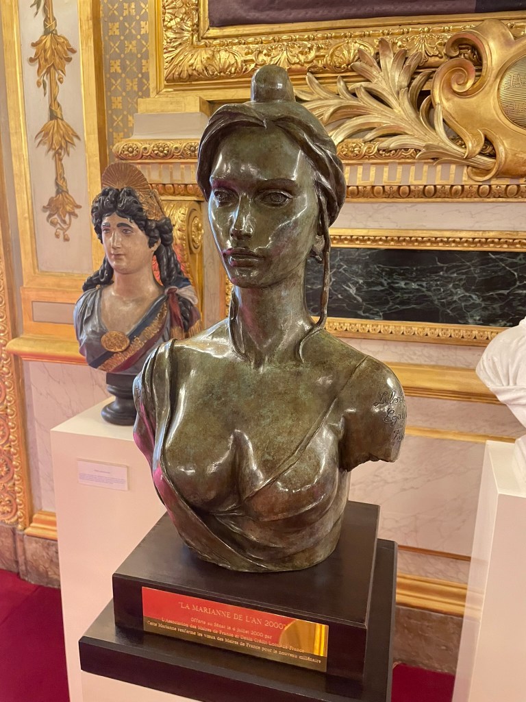 Cette sculpture m’a été inspirée par une visite au Sénat où sont exposées plusieurs sculptures de Marianne. J’ai bien sûr réinterprété deux d’entres elles en y ajoutant une petite touche/larme inspirée par l’époque actuelle.