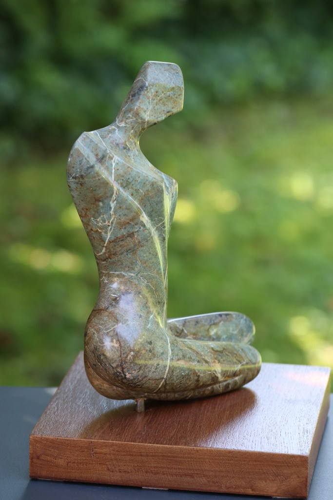 Cette stéatite présente une très jolie couleur verte avec des taches brunes et des veinages blancs très marqués qui accompagnent le mouvement du corps de cette femme stylisée.